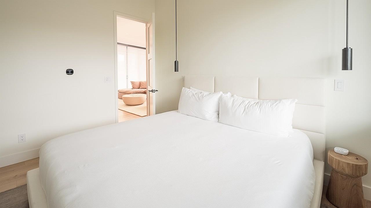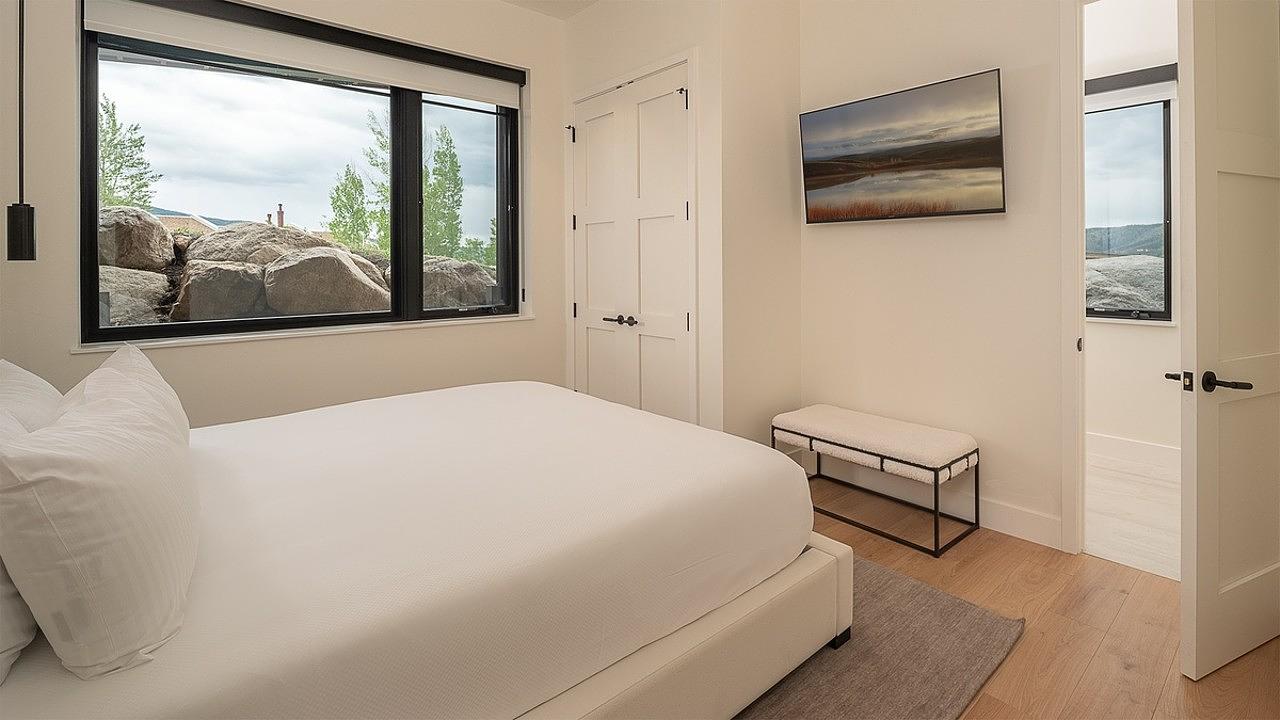 Each of the five bedrooms at Falcon Crest is designed as a serene sanctuary, offering comfort, privacy, and modern luxury. The primary suite, located on the main level, features a king bed, private deck access, and a one-of-a-kind ensuite bathroom. A freestanding soaking tub, oversized shower, and double vanity with suspended mirrors are all arranged to maximize views to the west. The suite also includes a high-tech bidet toilet, adding a touch of modern indulgence.
