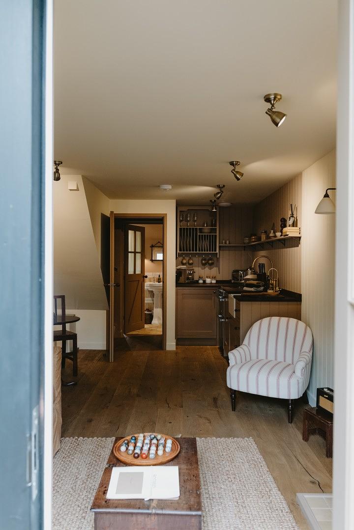 Honouring the building’s heritage, The Harness Room has been transformed into a serene one-bedroom retreat, thoughtfully designed with modern comforts and cosy touches. It features a king-size bed and a snug nook bed for little ones, a bathroom with both bath and shower, a fully equipped kitchen, and a welcoming biofuel fire. Outside, a private terrace offers a peaceful spot to relax, and can also be opened to connect with the Wood Shed and Wagon Lodges for a more sociable stay.