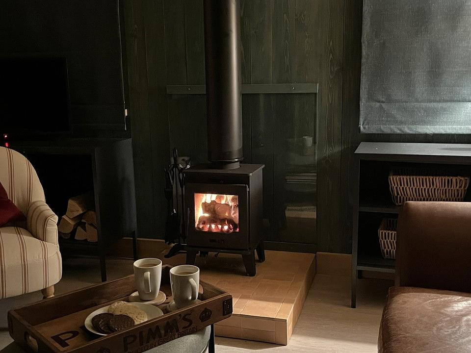 A bright and welcoming space featuring a comfortable lounge with a cosy log burner and smart TV with complimentary Netflix for relaxed nights in. Enjoy meals at the dining table for two or cook in the fully equipped kitchen, complete with an oven, induction hob, full-height Smeg fridge-freezer, dishwasher, and a Nespresso machine to start your mornings with the perfect coffee.