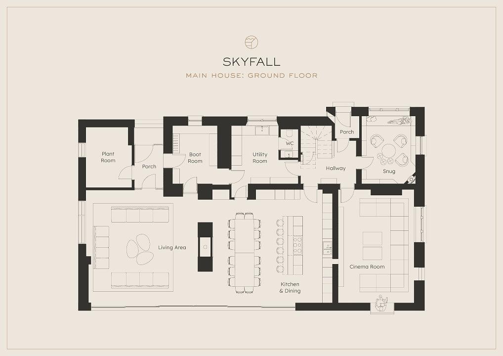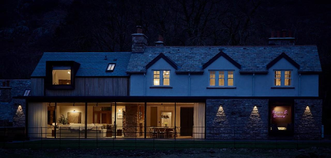 Skyfall is a luxurious and thoughtfully designed home nestled in the picturesque western Lake District. The property seamlessly blends traditional Lakeland aesthetics with contemporary Scandinavian-inspired interiors. At the heart of the house is the expansive open-plan kitchen, dining, and lounge area, which boasts a double-sided log burner and large glass bifold doors that open to stunning views of the River Esk and the surrounding fells. Additional spaces include a cozy library snug, a private cinema room, and a hot tub, ensuring that every detail has been catered to for relaxation and entertainment.