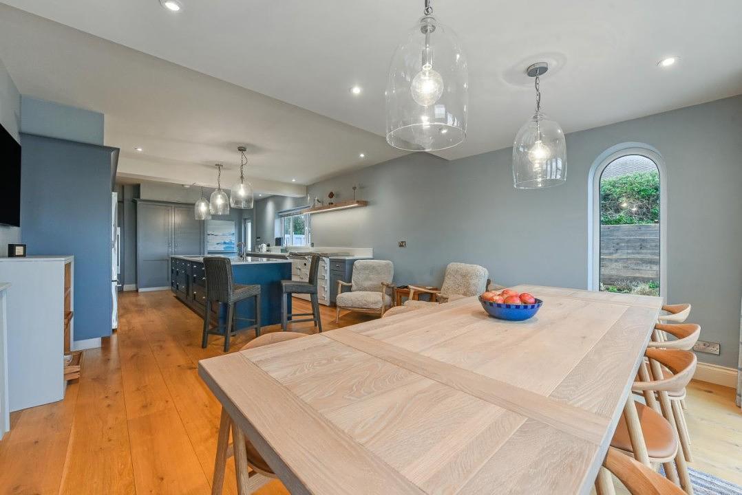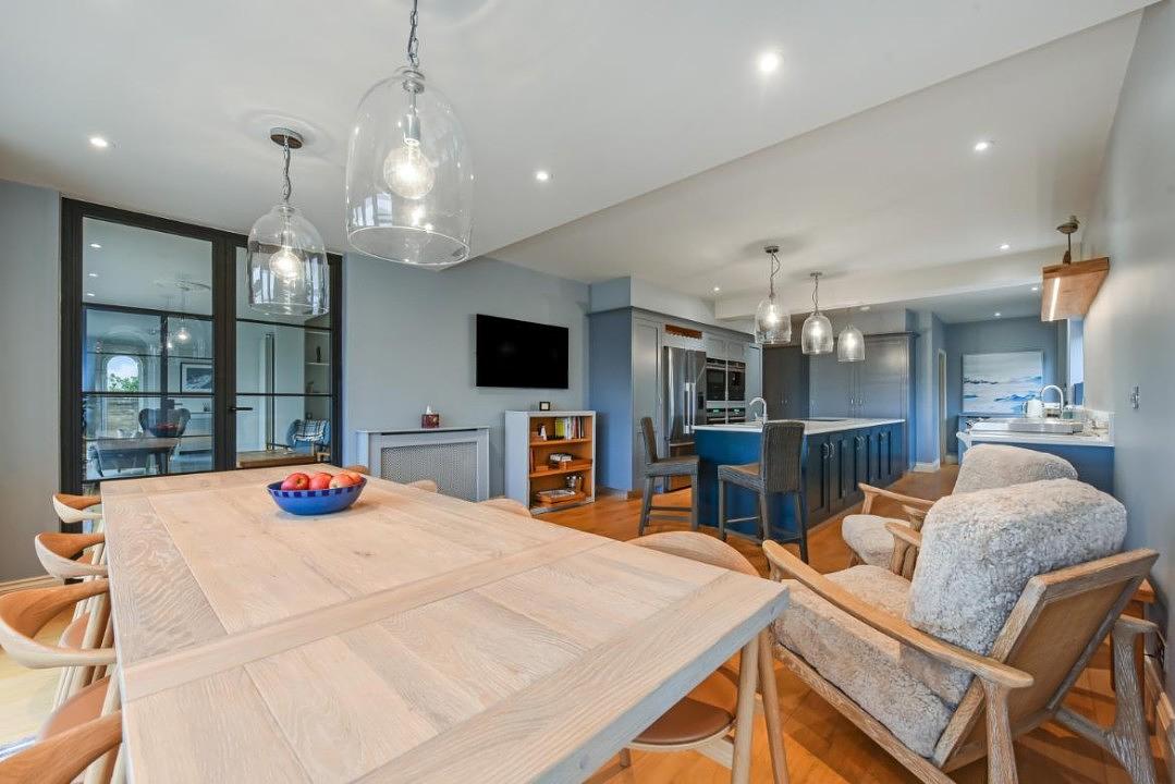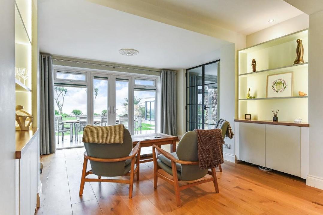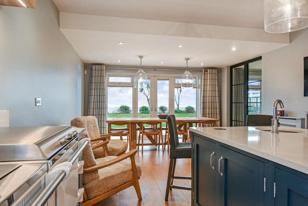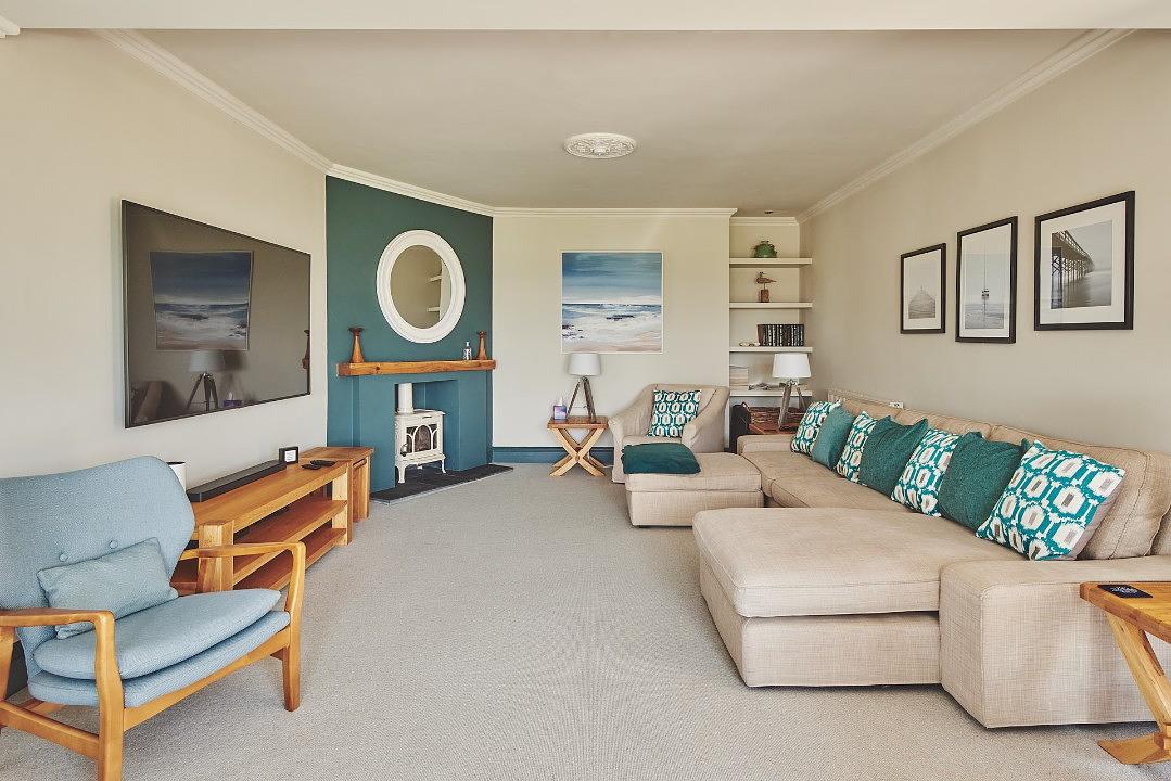 Designed for comfort and connection, the main living area is a bright, open space with bi-fold doors that lead directly onto the balcony, blending indoor and outdoor living. A log burner adds warmth and atmosphere in cooler months, while the 85-inch Smart TV with full Sky package offers cinema-style entertainment for cosy nights in. With ample seating, modern design, and thoughtful details throughout, it's the perfect space to relax, socialise, or simply take in the ever-changing sea views.