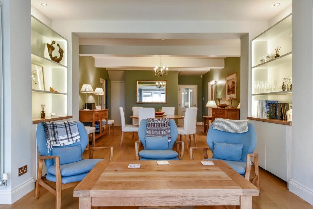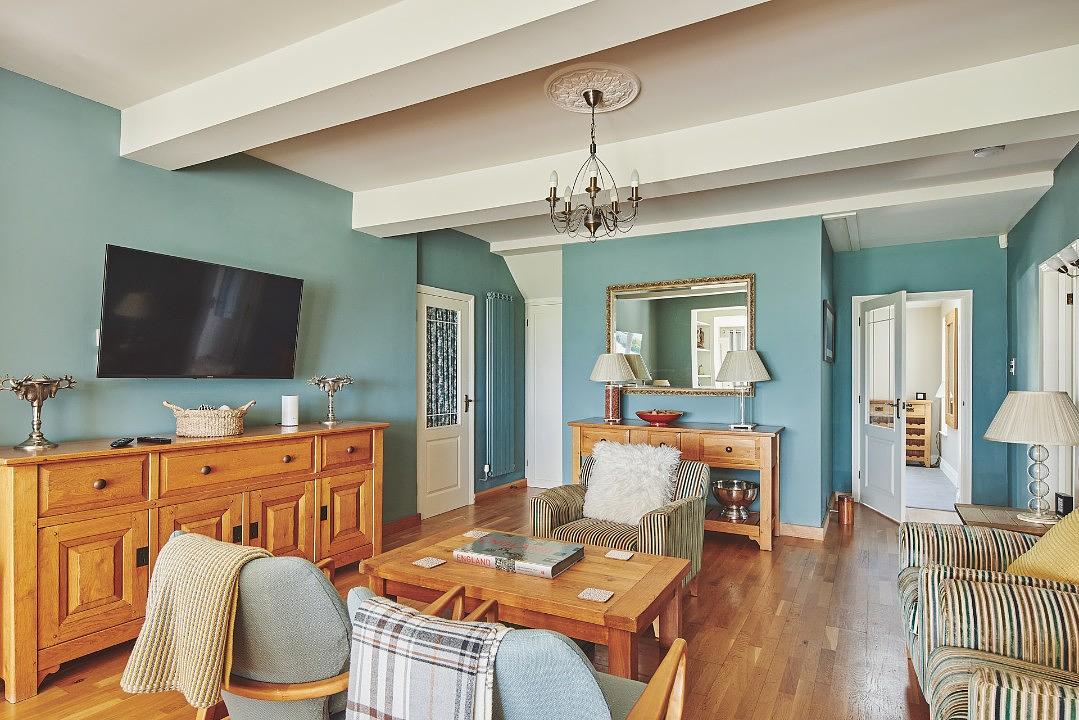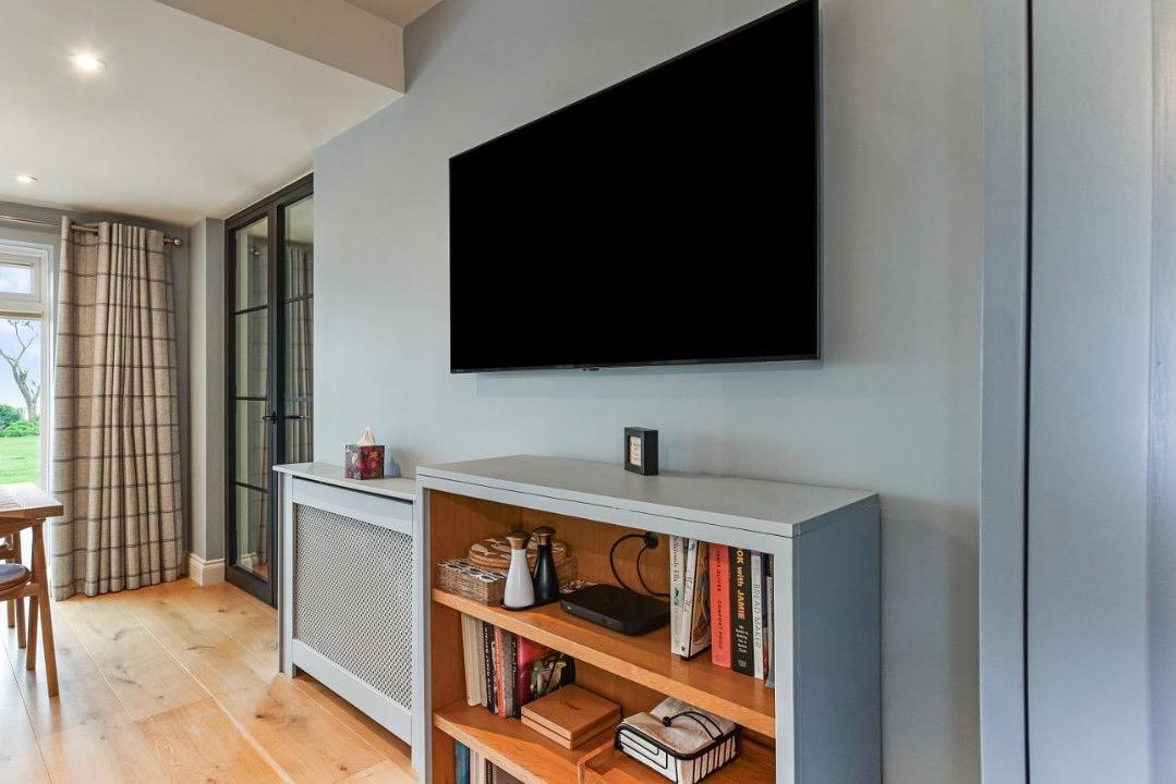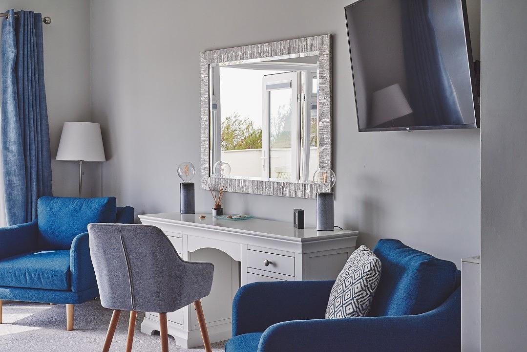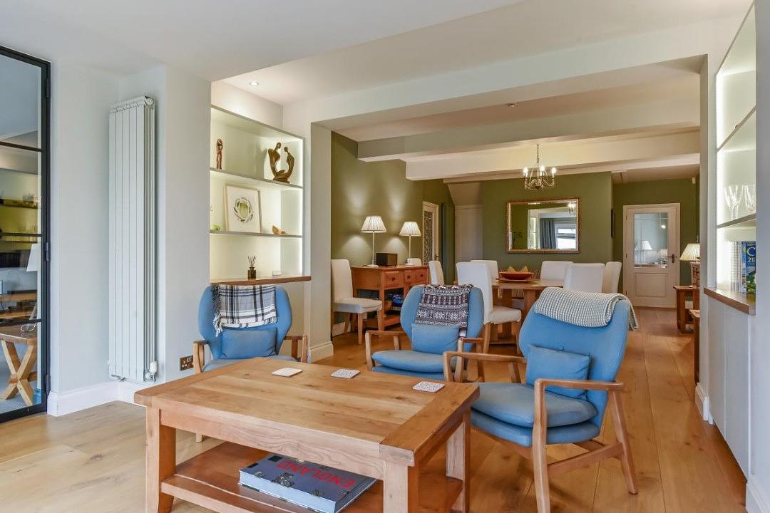 Designed for comfort and connection, the main living area is a bright, open space with bi-fold doors that lead directly onto the balcony, blending indoor and outdoor living. A log burner adds warmth and atmosphere in cooler months, while the 85-inch Smart TV with full Sky package offers cinema-style entertainment for cosy nights in. With ample seating, modern design, and thoughtful details throughout, it's the perfect space to relax, socialise, or simply take in the ever-changing sea views.
