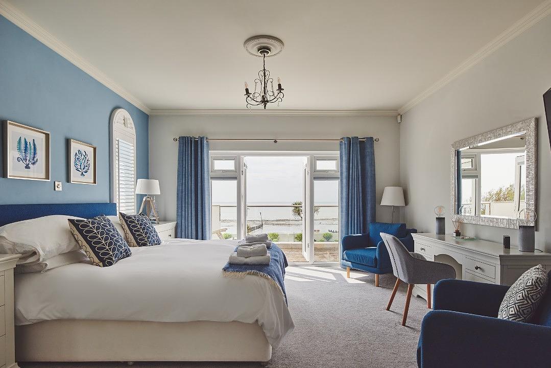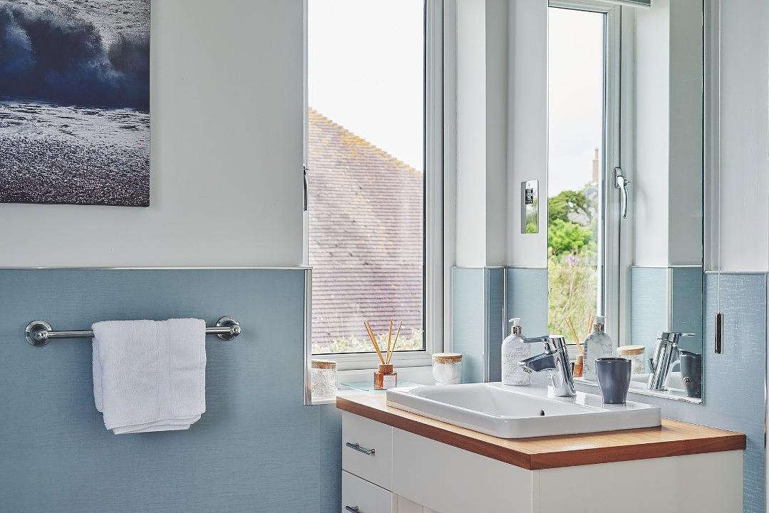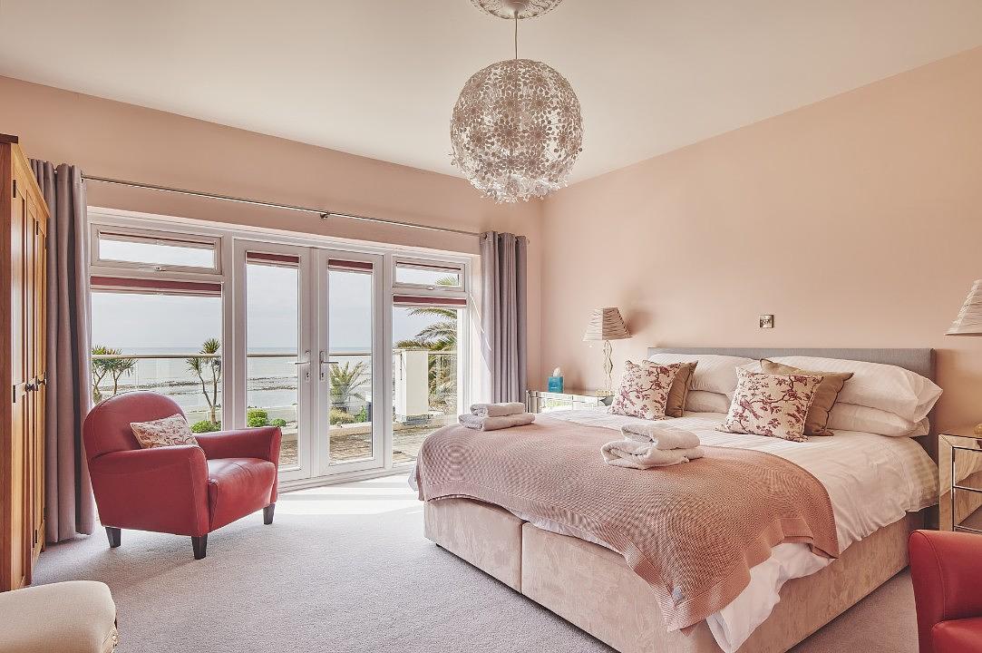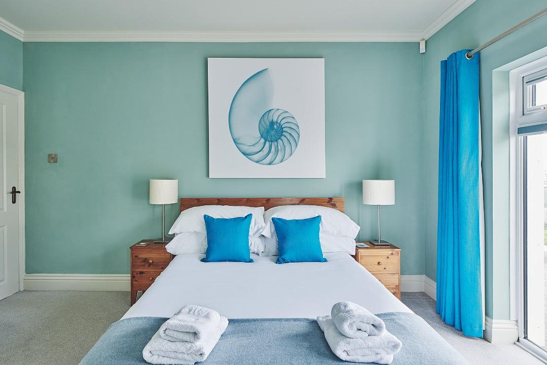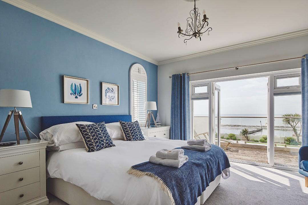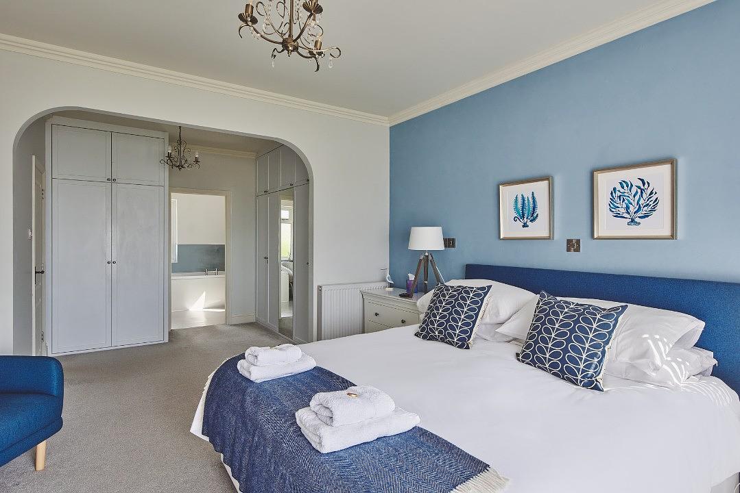 Ocean Edge features five beautifully appointed bedrooms, sleeping up to ten guests in total comfort. Three of the rooms have direct access to the huge sea-view balcony, while the Crow’s Nest suite on the top floor offers spectacular elevated views and a private ensuite bathroom. The interiors are designed with a calming coastal palette, ensuring restful nights and peaceful mornings. Across the home you'll find three modern bathrooms, all finished to a high standard for added luxury and convenience.