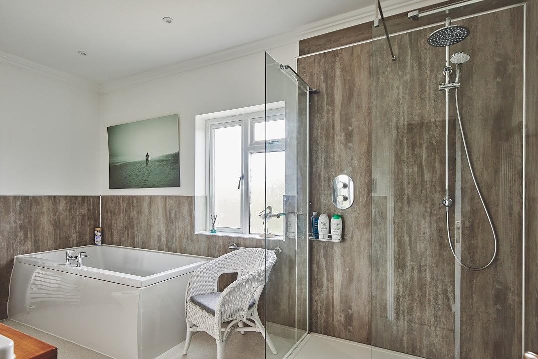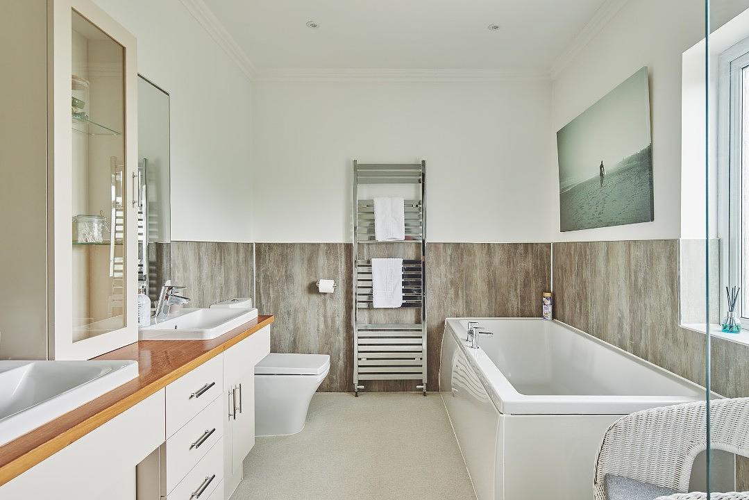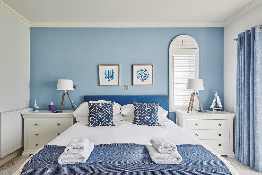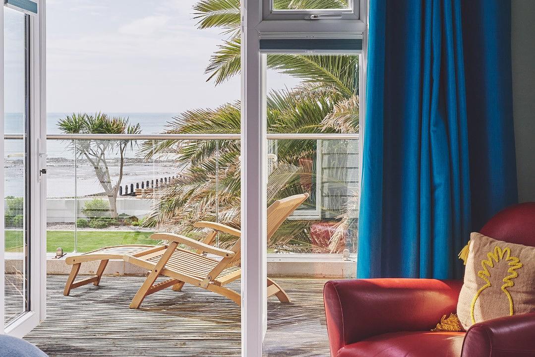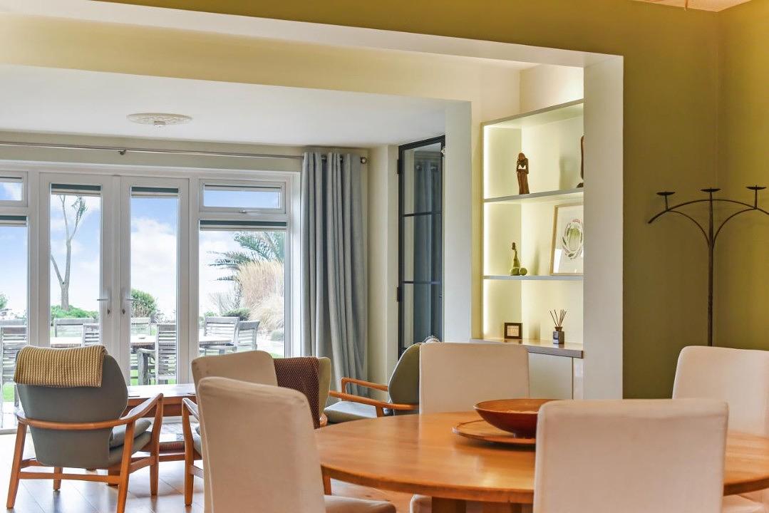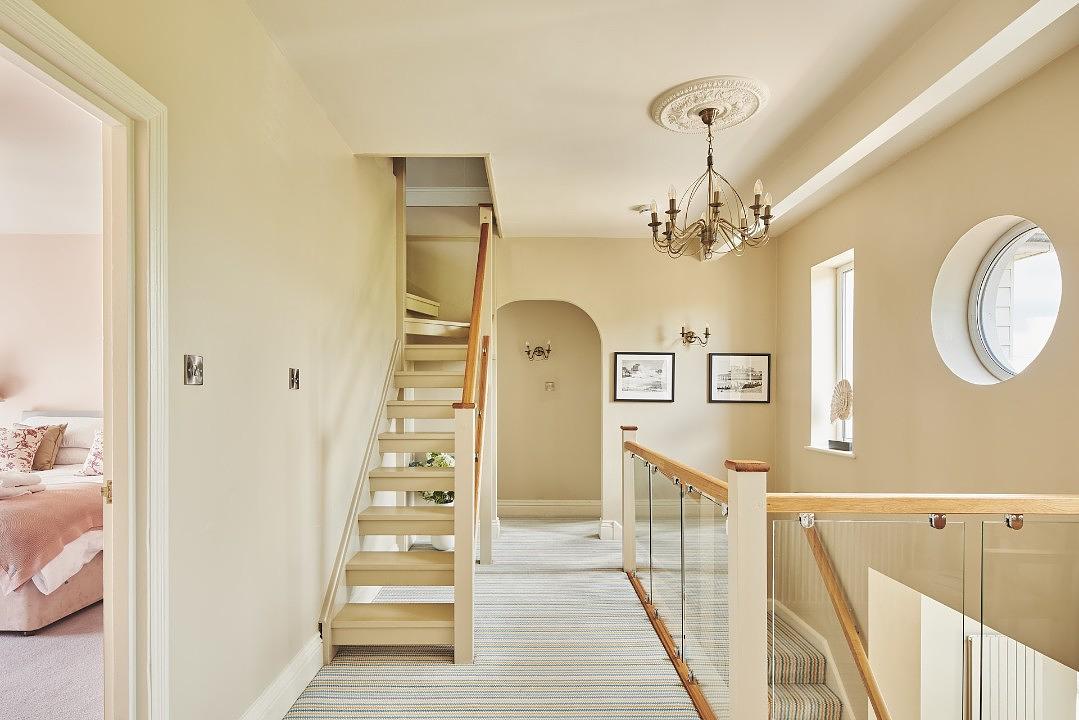 Ocean Edge features five beautifully appointed bedrooms, sleeping up to ten guests in total comfort. Three of the rooms have direct access to the huge sea-view balcony, while the Crow’s Nest suite on the top floor offers spectacular elevated views and a private ensuite bathroom. The interiors are designed with a calming coastal palette, ensuring restful nights and peaceful mornings. Across the home you'll find three modern bathrooms, all finished to a high standard for added luxury and convenience.