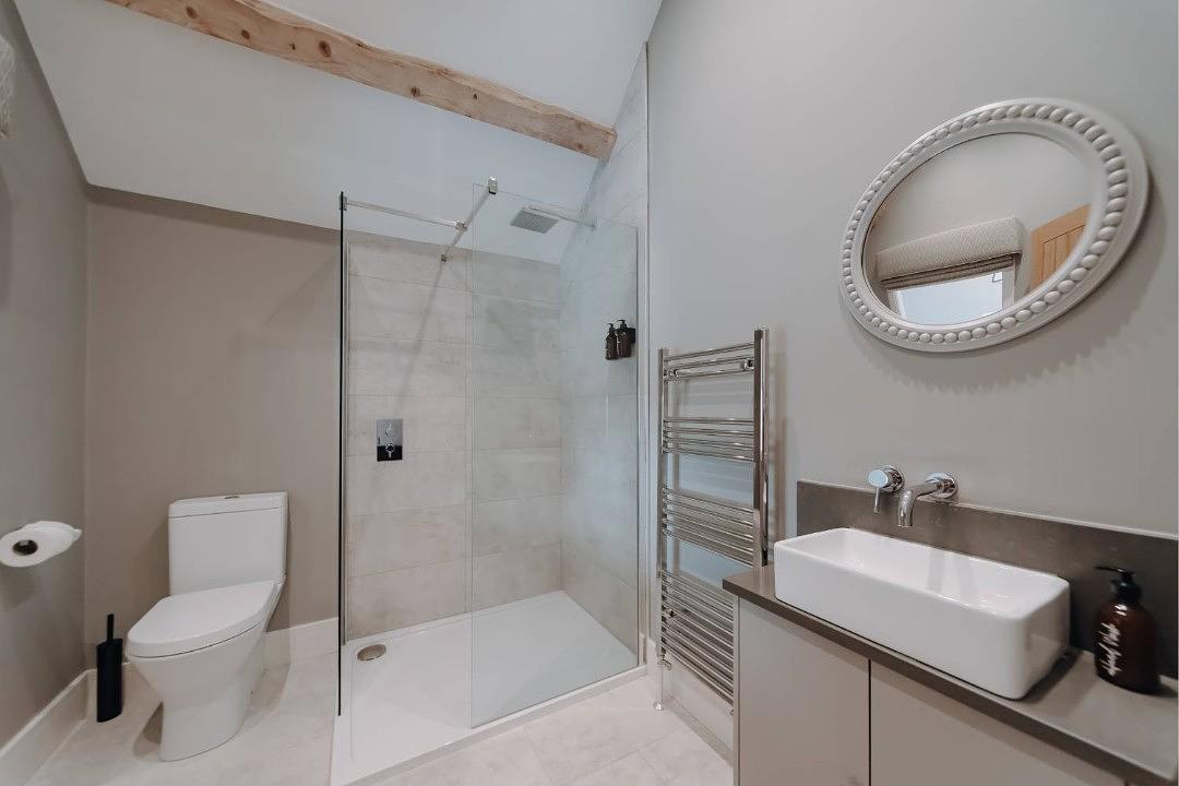 To complement the two bedrooms, Swallows Barn offers two well-appointed bathrooms. The ground floor boasts a stylish en-suite with a walk-in shower, elegant roll-top bath, and twin sinks. Upstairs, the second bathroom features a spacious walk-in shower and the added luxury of underfloor heating, perfect for a cosy start to the day.