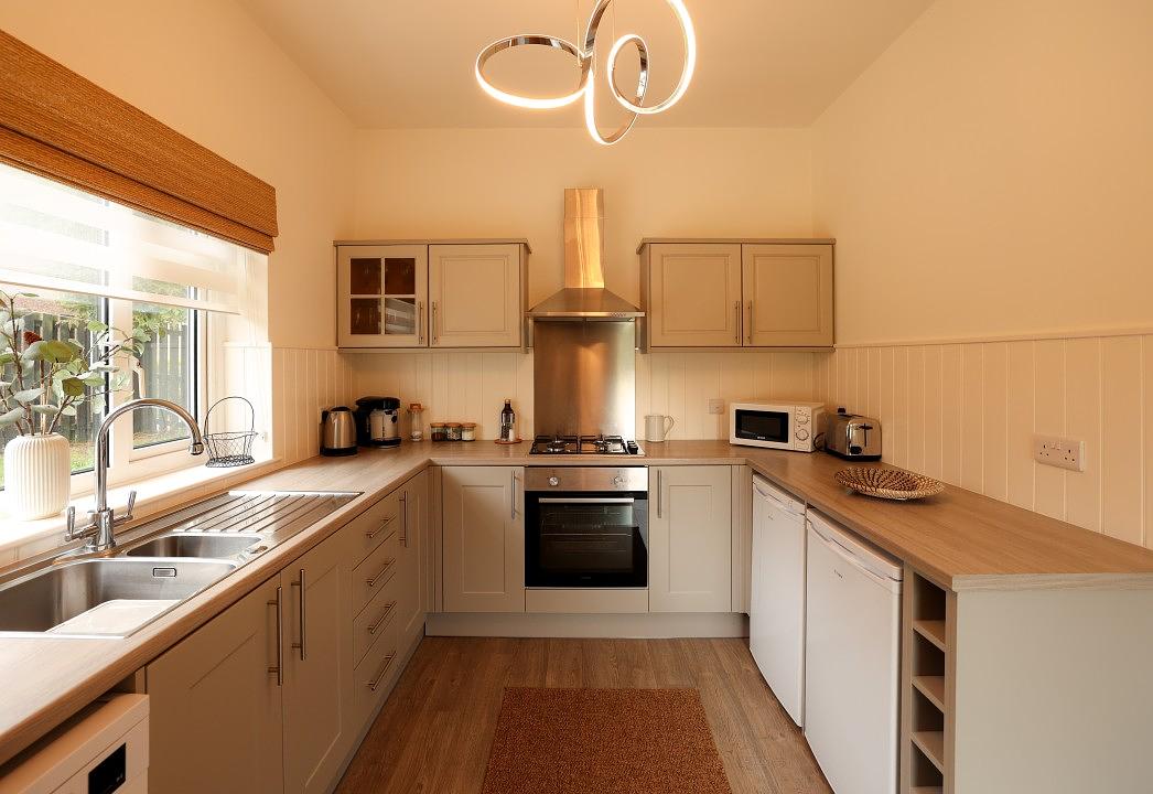 The kitchen flows seamlessly into the lounge, featuring a dining table for all guests, a comfortable sofa, and a TV. An electric woodburner-style fire adds a cosy touch, while patio doors provide direct access to the outdoor area and hot tub, perfect for relaxing or entertaining.