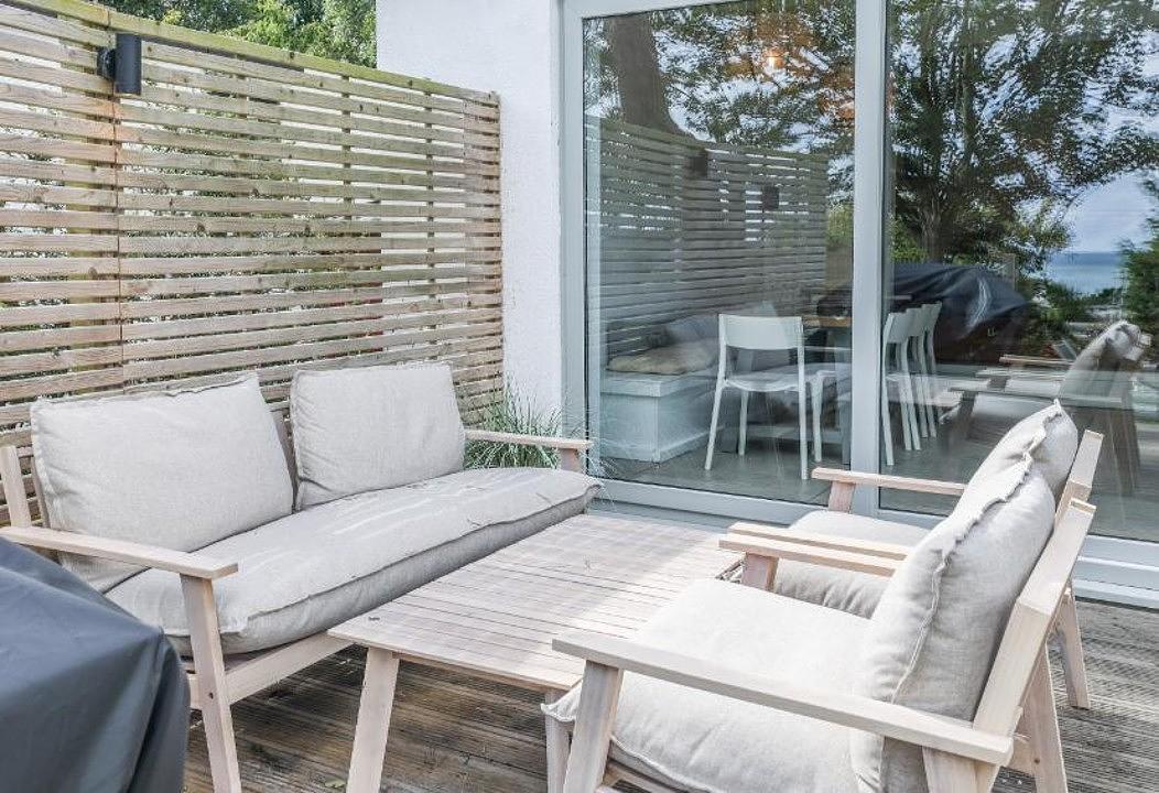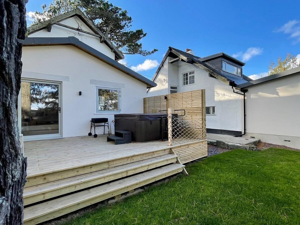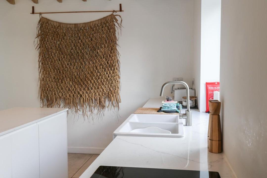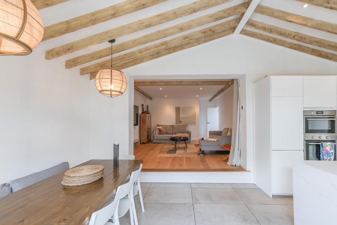 The decking area is also connected by a hatched window, providing the most unique breakfast bar area on the island. The fully equipped kitchen with a wine cooler and downdraft extractor hob, are complimented by the separate utility room and downstairs w/c.
