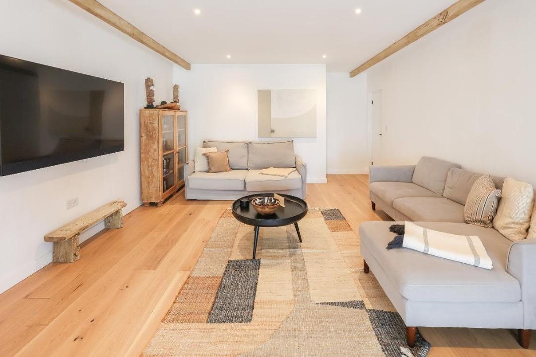Off the entrance area is a spacious king sized bedroom with level access for all guests, and the main entertaining space. You enter the main living space through the lounge snug, with an L-shaped sofa for the evening’s relaxation. Through the lounge you step down in the open plan kitchen dining area, with an inbuilt dining banquette and adjoining sliding doors onto the private decking area.