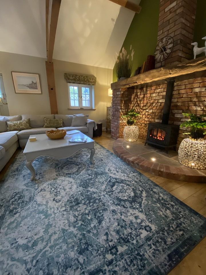 The heart of The Mews is its spacious open-plan living and dining area, thoughtfully designed to bring people together. With high ceilings, exposed beams, and a grand gas wood-burner effect fireplace as the focal point, the space feels both cosy and elegant. Deep, plush sofas invite you to sink in and relax after a day of exploring, while the soft lighting and warm tones create a welcoming atmosphere throughout.
