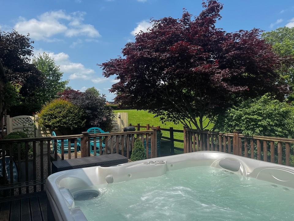 The outdoor area at The Mews is designed for relaxation and entertaining, perfectly complementing its peaceful countryside setting. From the kitchen, step out into the private rear garden where a six-person hot tub invites you to unwind while soaking in stunning views over open fields. Whether it’s a morning dip or an evening soak under the stars, this space offers a serene escape.