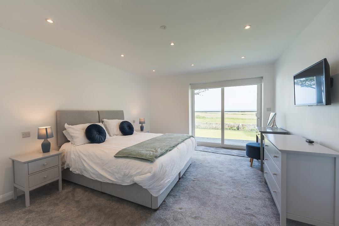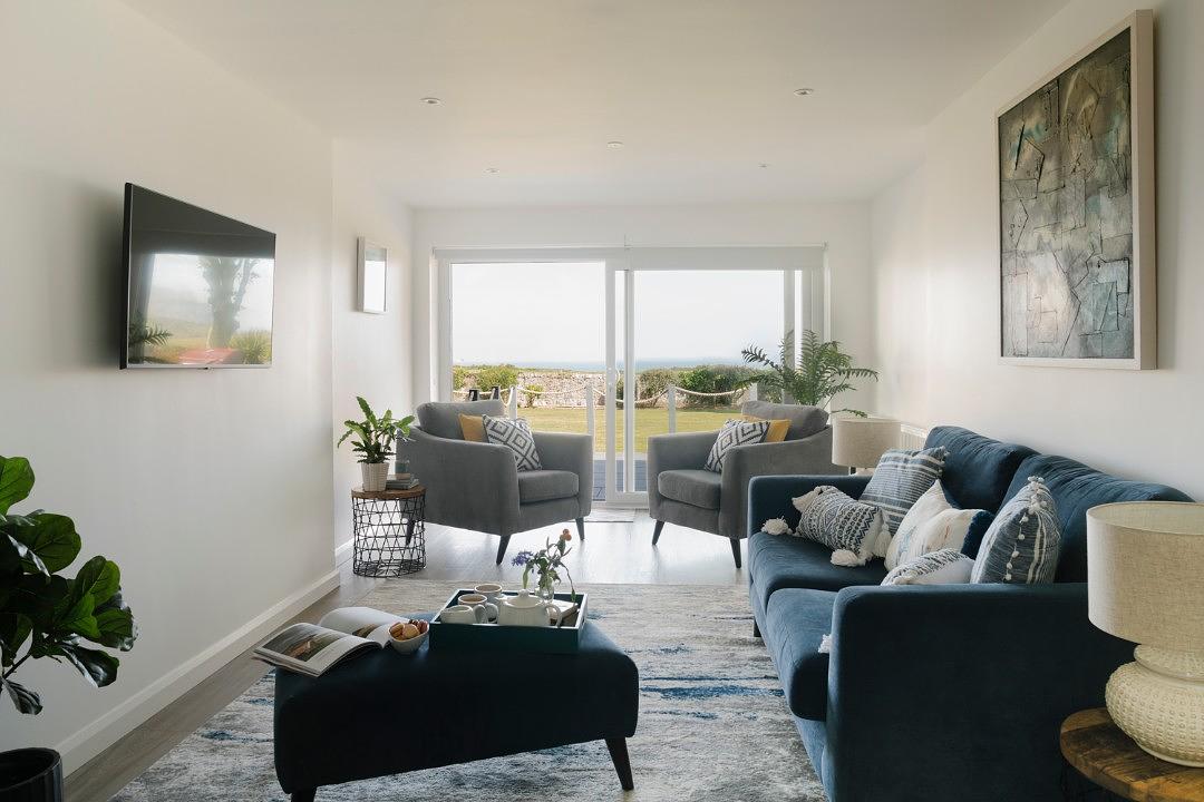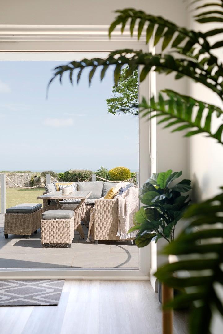 Inside, the property is designed with space, light, and relaxation in mind. The living areas feature modern, comfortable furniture within rooms that have large French doors, inviting in light and allowing guests to enjoy the view.