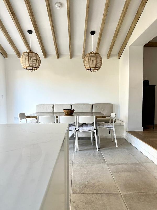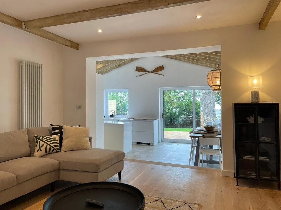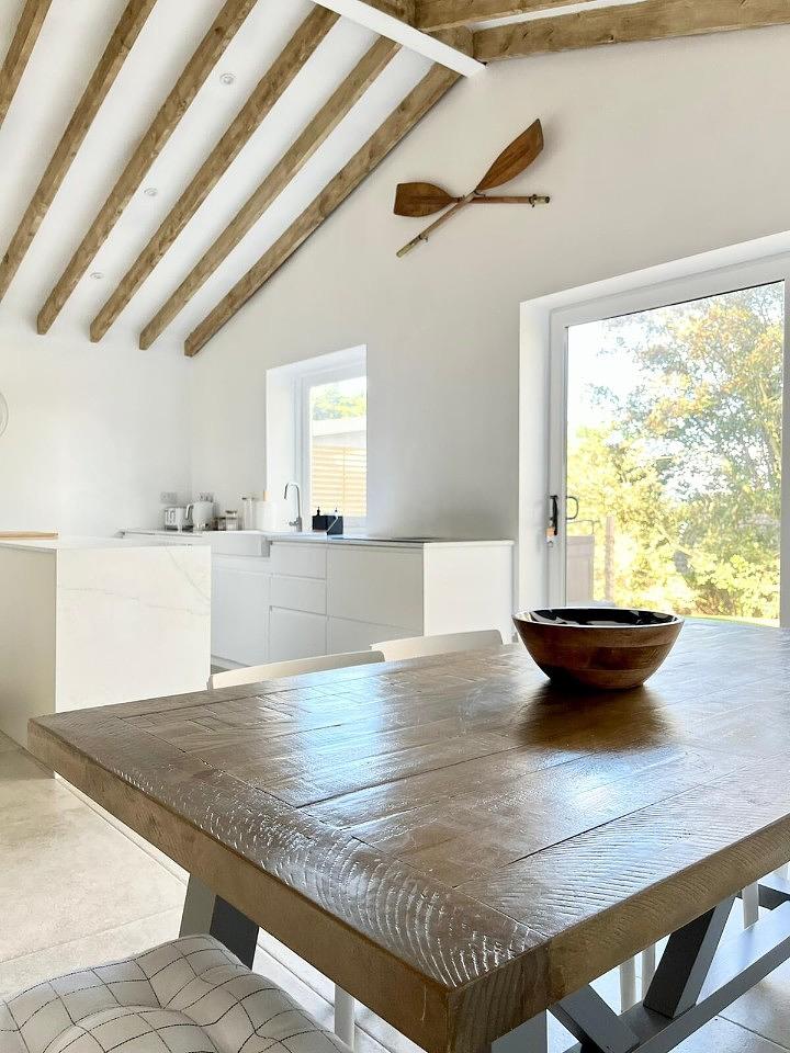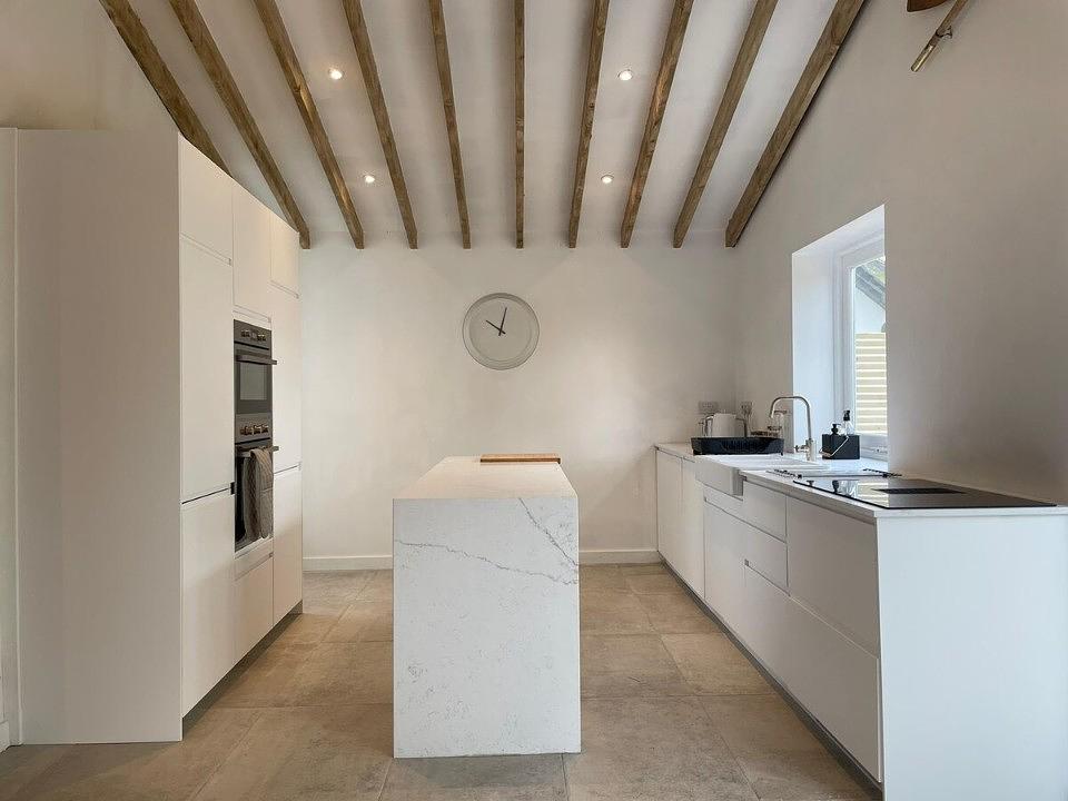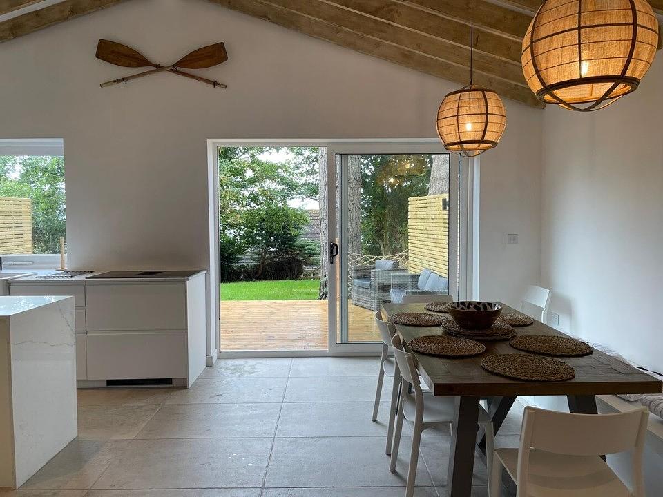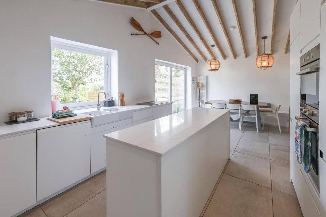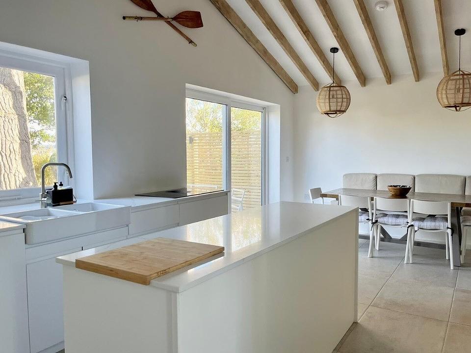 The decking area is also connected by a hatched window, providing the most unique breakfast bar area on the island. The fully equipped kitchen with a wine cooler and downdraft extractor hob, are complimented by the separate utility room and downstairs w/c.