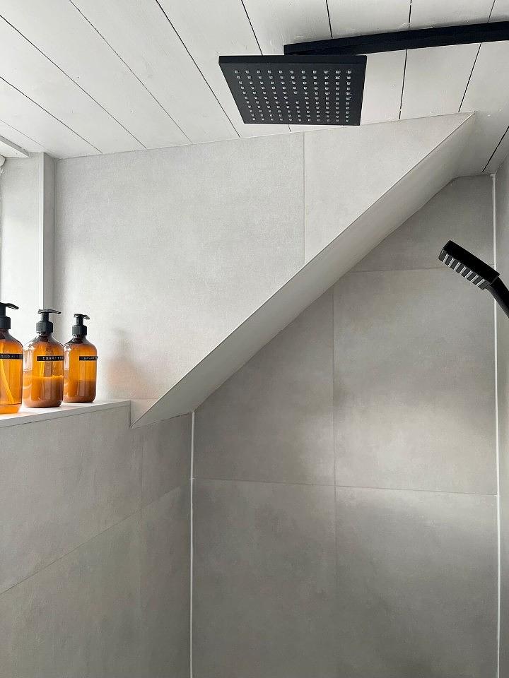 Family bathroom with bath and overhead rain shower