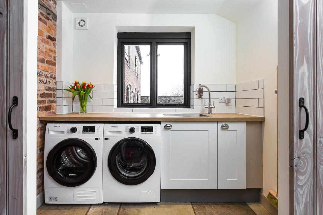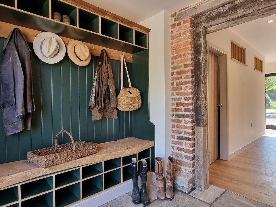 The light and airy boot room provides plenty of space to store coats, boots, and all your outdoor gear, with spare umbrellas ready for those unexpected rainy days. Adjacent, the fully equipped utility room includes a washing machine, tumble dryer, drying rack, iron and board, plus a supply of 12 grey towels, ideal for beach trips or drying off after a day of outdoor adventures.