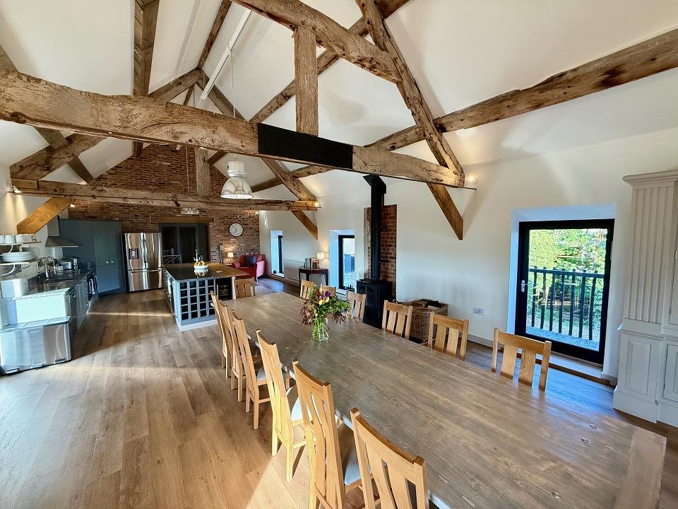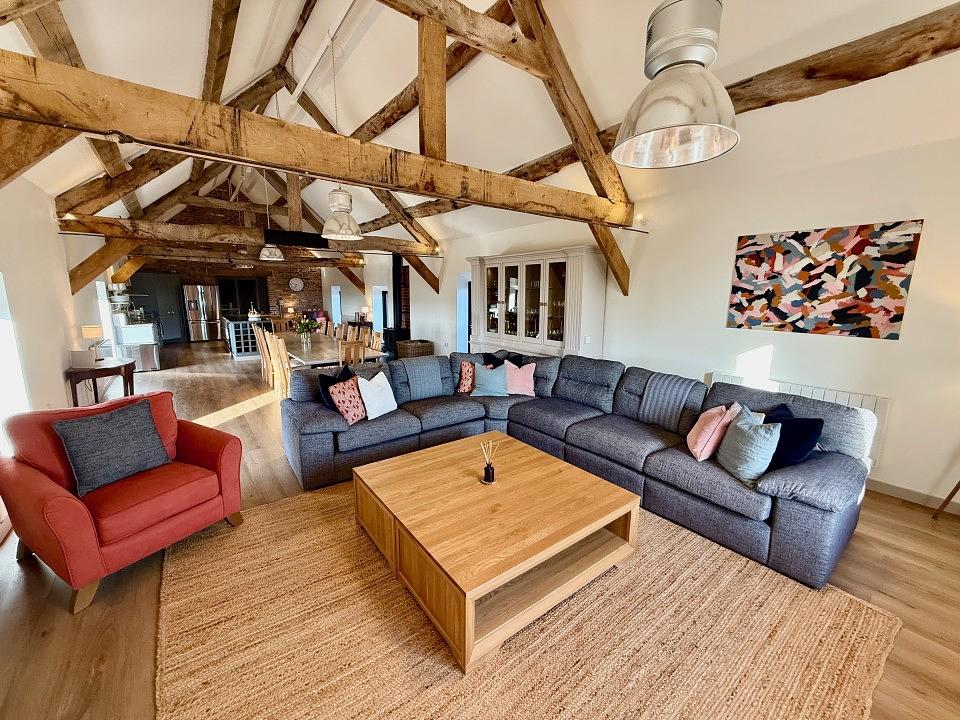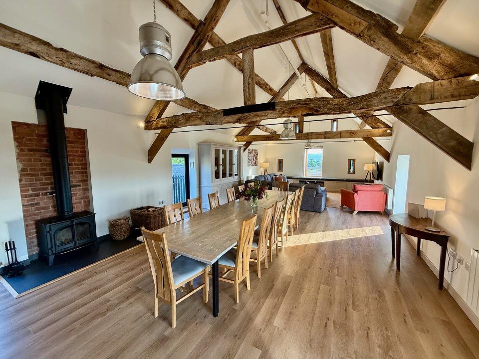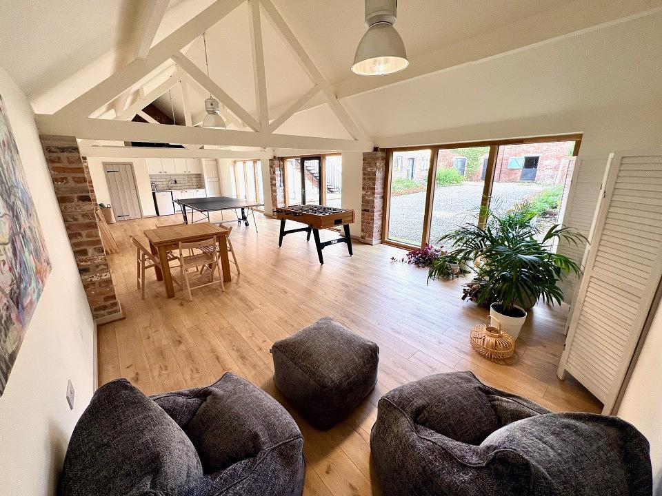 Blending rustic character with modern style, The Vale Barn showcases soaring high-beamed ceilings, exposed brickwork, sleek Scandinavian design, and bursts of vibrant abstract art. Inside, the spacious open-plan living area is ideal for relaxing, entertaining, and sharing meals, while the cosy snug offers a quiet retreat and the games room promises hours of fun. Step outside to cook in the outdoor kitchen, dine on the sunset deck, or gather around the log fire pit for unforgettable evenings under the stars.