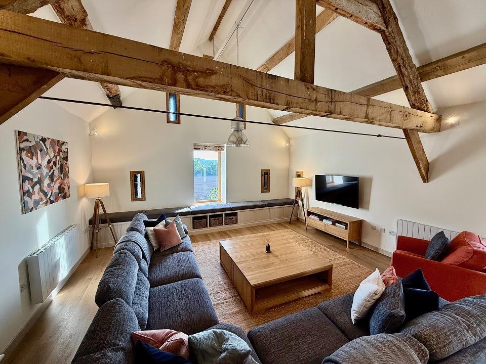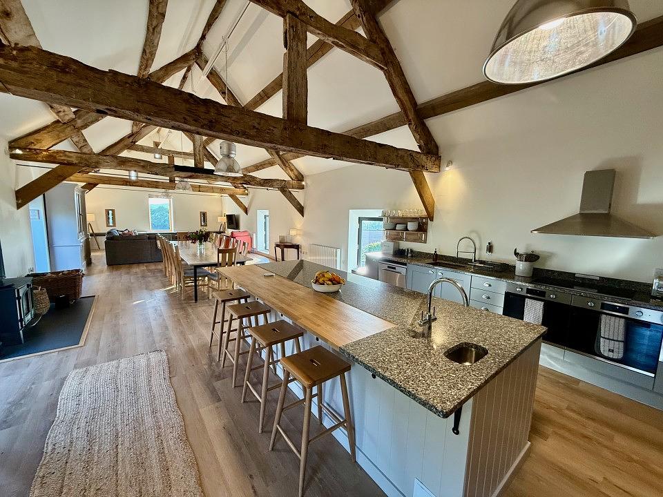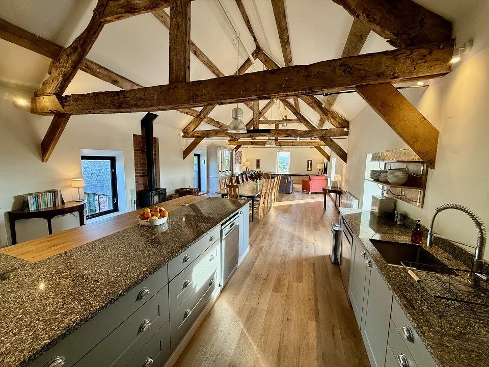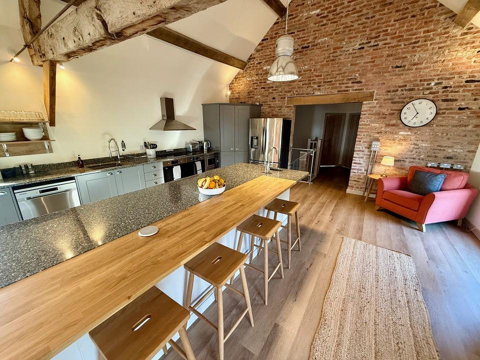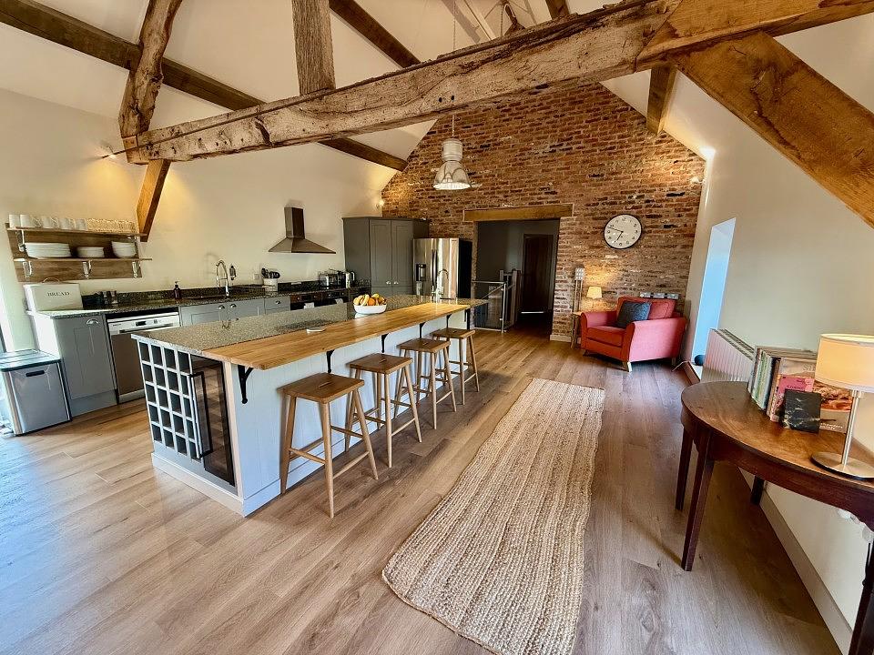 Upstairs, The Vale Barn’s stunning open-plan kitchen, dining, and living area is the heart of the home. Framed by original beams, soaring ceilings, and exposed brickwork, this impressive communal space is designed for guests to gather, cook, share stories, and unwind together. Flooded with natural light and warmed by its welcoming atmosphere, it offers a fully equipped kitchen with two ovens, two dishwashers, a large induction hob, blender, American fridge freezer, wine cooler, and generous pantry space, making it a cook’s dream.