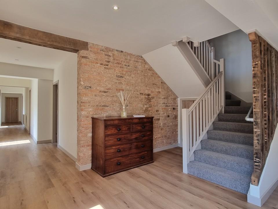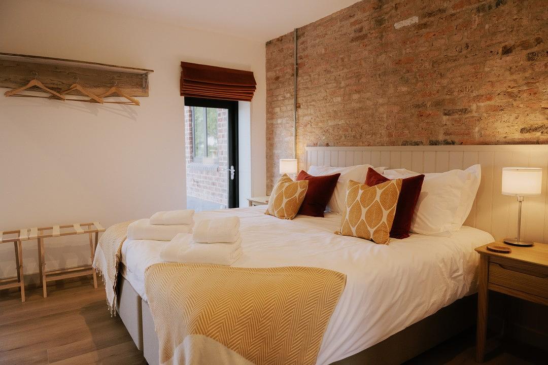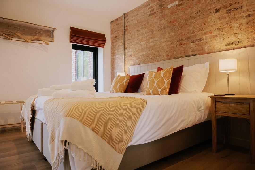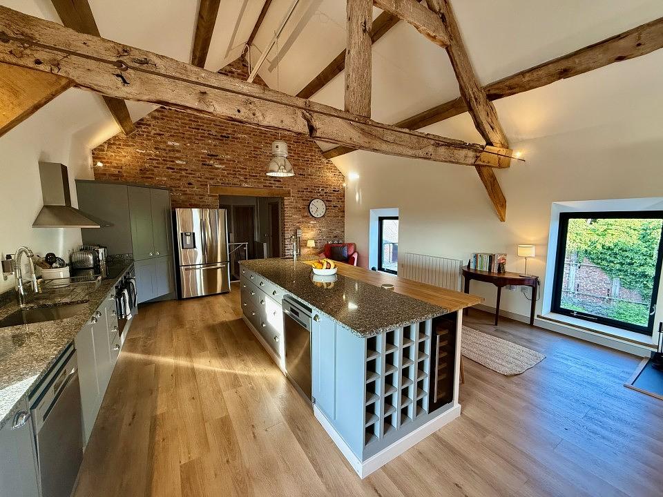 Upstairs, The Vale Barn’s stunning open-plan kitchen, dining, and living area is the heart of the home. Framed by original beams, soaring ceilings, and exposed brickwork, this impressive communal space is designed for guests to gather, cook, share stories, and unwind together. Flooded with natural light and warmed by its welcoming atmosphere, it offers a fully equipped kitchen with two ovens, two dishwashers, a large induction hob, blender, American fridge freezer, wine cooler, and generous pantry space, making it a cook’s dream.