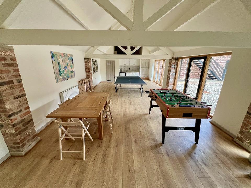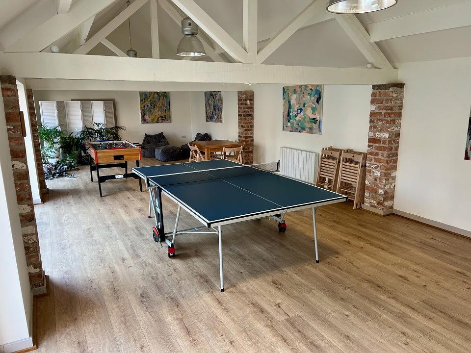 The Studio Space is a versatile area designed for both fun and relaxation. When set up as a games room, it’s equipped with a ping-pong table, foosball table, extendable table with chairs, a selection of games, a handy kitchenette, and a downstairs loo, perfect for hours of entertainment. For yoga retreats or mindful mornings, the space transforms into a serene practice studio. Three complimentary mats are provided for regular holiday stays, and a full collection of yoga equipment is available to hire for £150, just contact us to arrange.