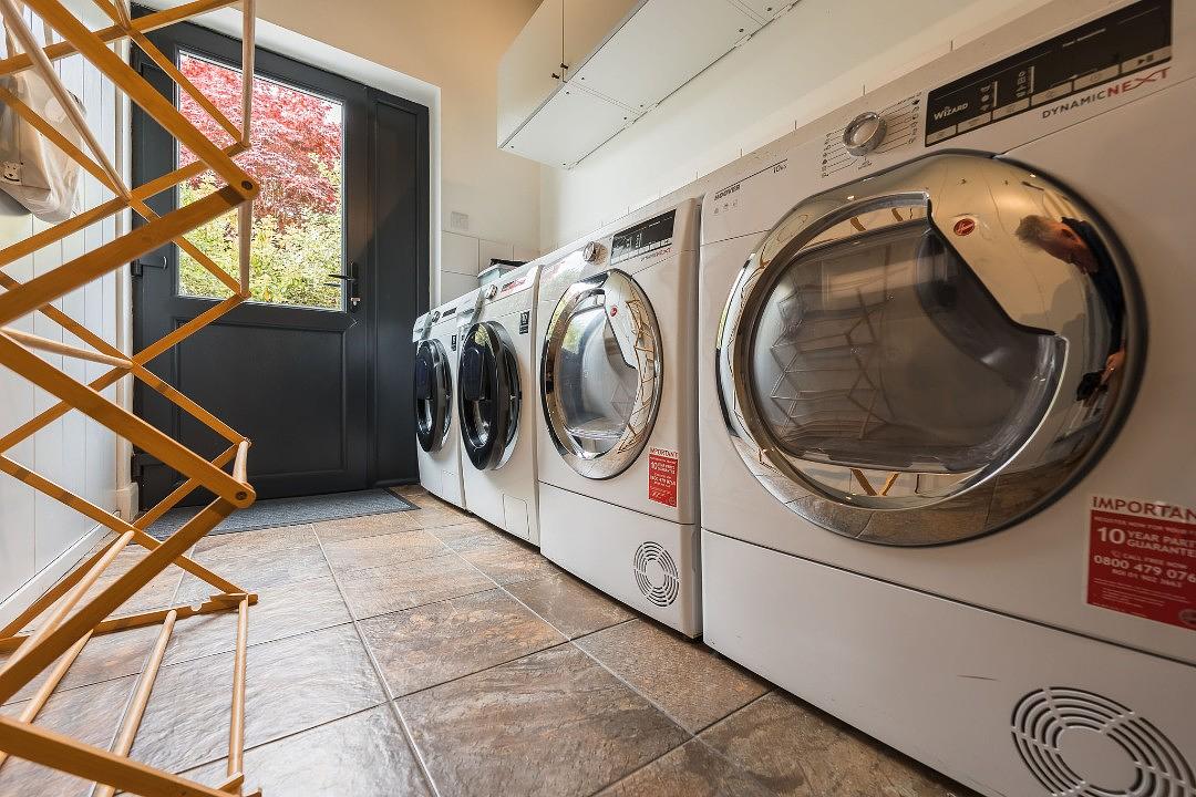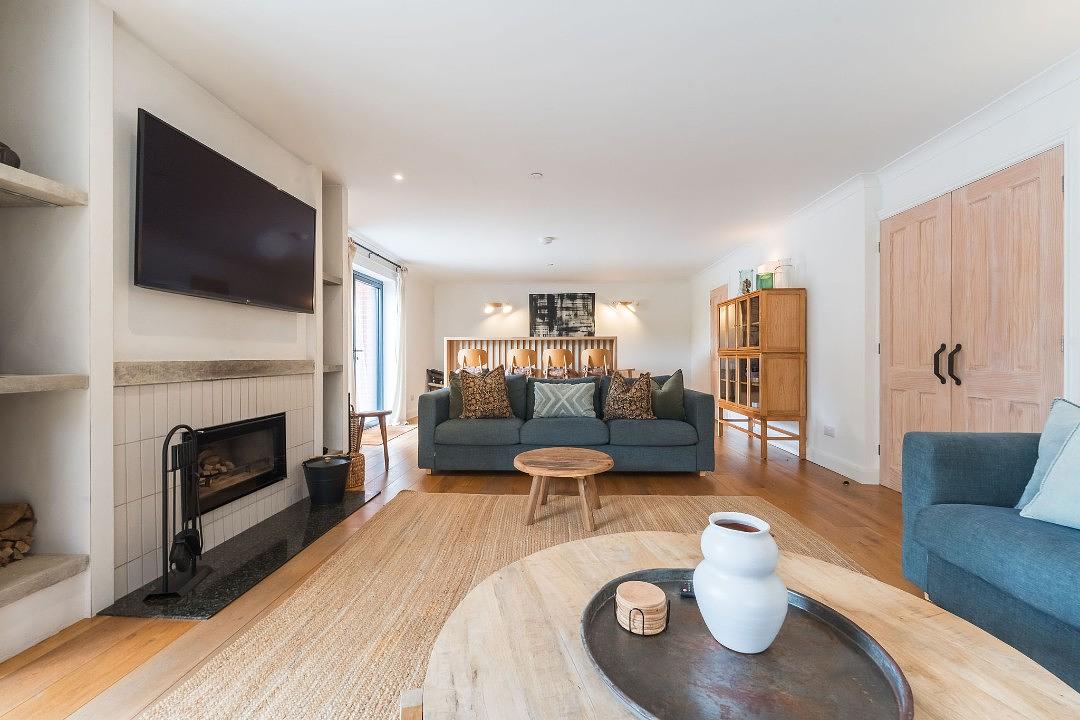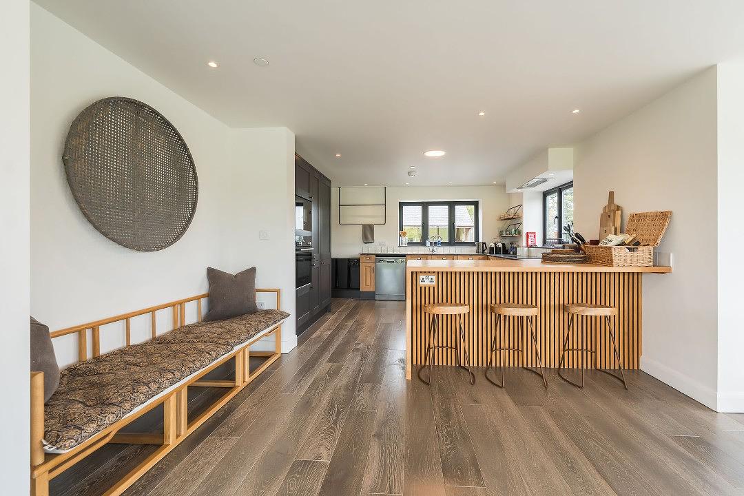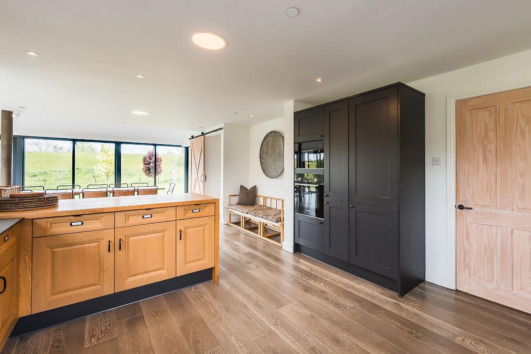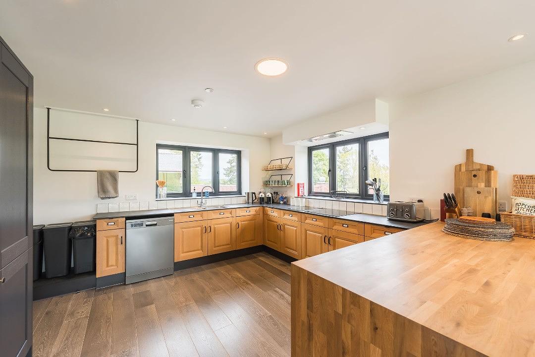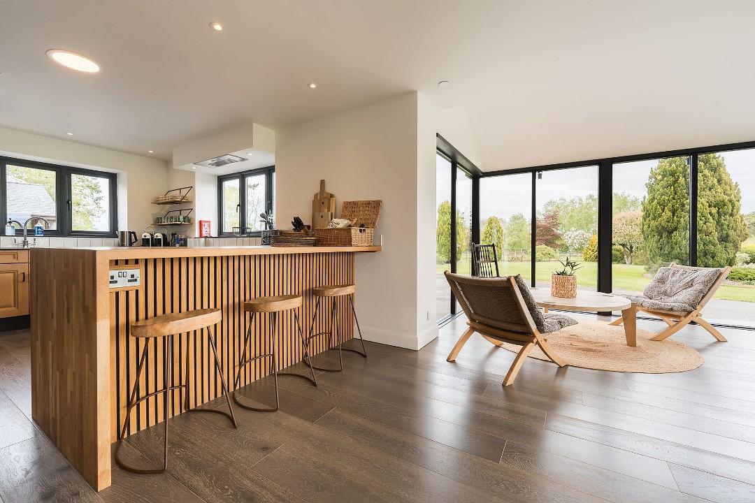 The morning sun in Ty Cefn’s fully-equipped, contemporary kitchen is so inviting, you’ll want to stay all day. Designed for open plan dining, the cool design, multiple seating areas and wrap-around floor to ceiling windows make this the true heart of the house. With two two-metre tables and a breakfast bar, all with a natural wood theme, this is a dining space like no other.