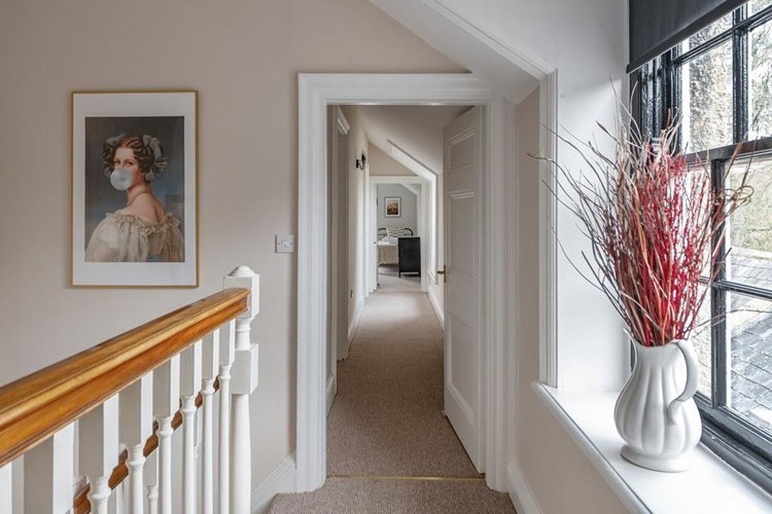 This remarkable residence becomes even more impressive upon entering. While the interior decor has been modernized, it still pays homage to its distinguished history. Constructed in 1800, many of its original characteristics remain preserved, complemented by contemporary luxuries. Envision traditional open fireplaces, exposed wooden beams, and striking artwork, along with ample space for gatherings—whatever form that may take for you.