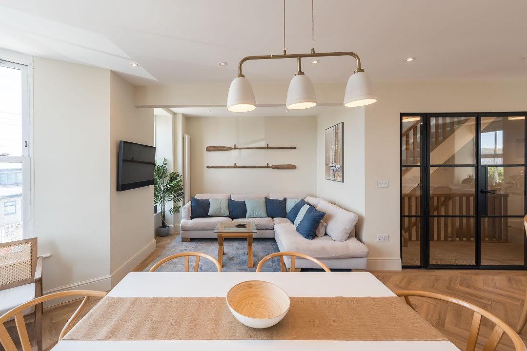 First-floor open-plan living space with kitchen, dining area and lounge area
