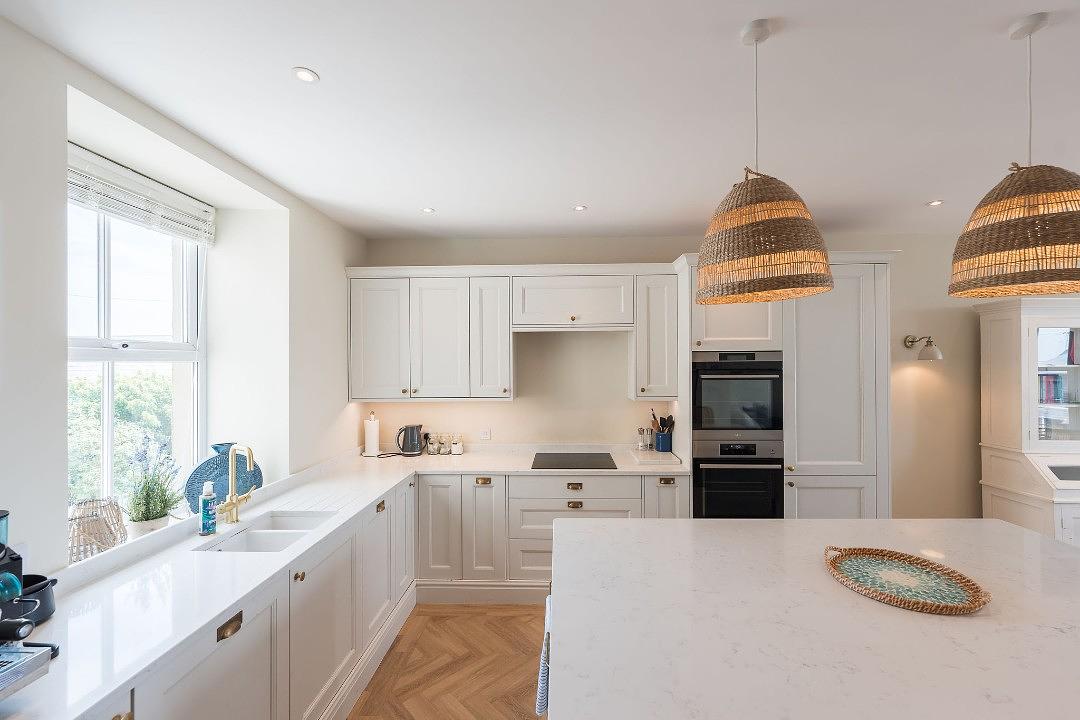 The open plan living and entertaining space is the ideal setting for cosy evenings after a day’s activities and with two separate lounges, there is plenty of space to provide a more sophisticated lounge and a nosier lounge for the younger guests! Through the large crittall doors the impressive open plan kitchen, dining and lounge area is the heartbeat of the home, and enjoys stunning views of the beach from several vantage points. The large granite kitchen island doubles as a social and culinary space, the kitchen includes electric oven, Nespresso coffee machine, fridge/freezer, dishwasher and wine chiller.
